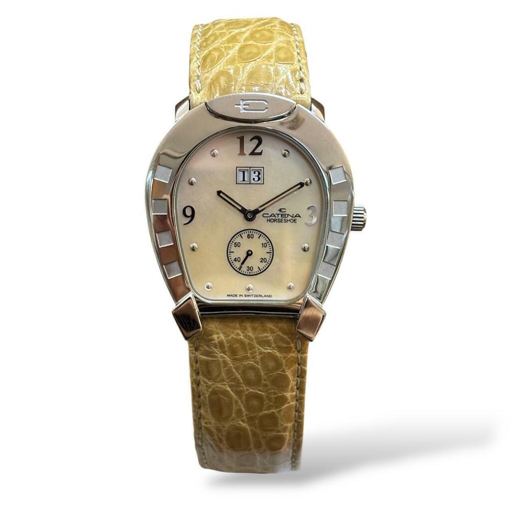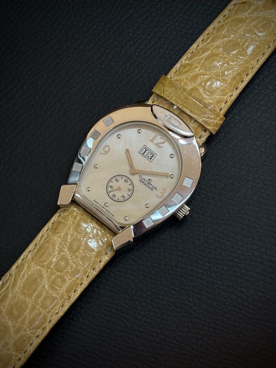 Diseño suizo con estética refinada: Caja con forma de herradura y bisel metálico facetado, con símbolo Catena grabado en la parte superior.