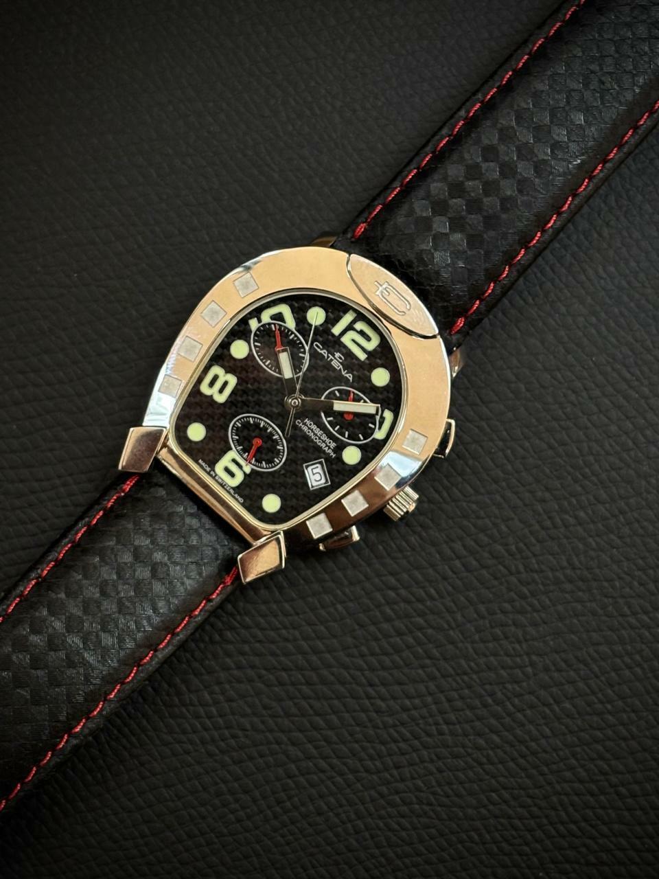 Diseño suizo con carácter deportivo: Caja en forma de herradura con bisel metálico pulido y pulsadores laterales que realzan su estética cronógrafo.