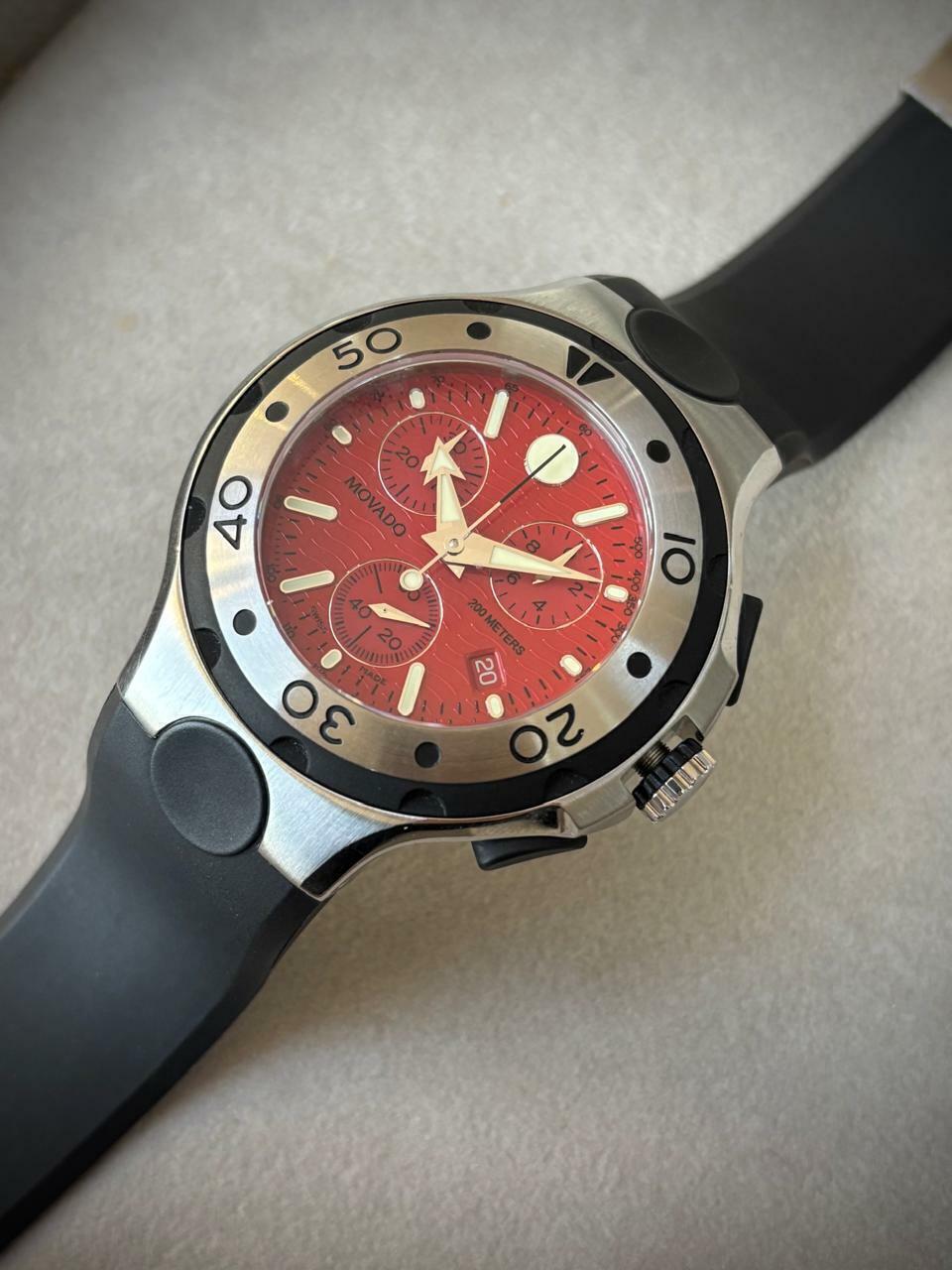 Esfera roja vibrante con cronógrafo: Dial llamativo con tres subesferas para cronómetro (30 minutos, segundos, décimas de segundo), índices aplicados y agujas luminiscentes.